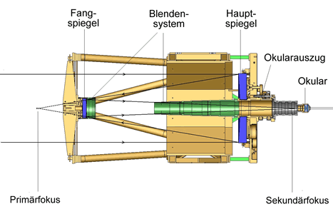 Das Licht des Objektes fällt auf den Hauptspiegel oder Primärspiegel (parabolisch geschliffen) und wird zum Fangspiegel oder Sekundärspiegel (konvex-hyperbolisch) reflektiert. Durch die Durchbohrung im Hauptspiegel lenkt der Fangspiegel das Licht zum Okularauszug, wo das Zwischenbild entsteht, das mit einer Lupe, dem Okular, betrachtet wird. Das Blendensystem von Haupt- und Fangspiegel dient zur Ausschaltung von Streu- und Fremdlicht. |