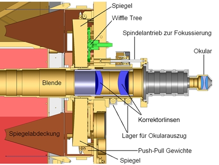 Es wird die zentrale Lagerung des Spiegels durch Blende und Okularauszug (Korrektor) deutlich. Auch die Lagerung des Spiegels mit Wiffle Tree und Push-Pull Gewichte ist zu erkennen. |
