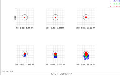 Die sechs Bilder der jeweiligen Diagramme zeigen die Größen der Beugungsscheibchen in unterschiedlichem Abstand zur optischen Achse. Das Bild links oben zeigt das Beugungsscheibchen (rot) auf der optischen Achse. Der schwarze Kreis gibt die theoretische Größe des Beugungsscheibchens aufgrund der Fernrohröffnung an. (Airy Disk)