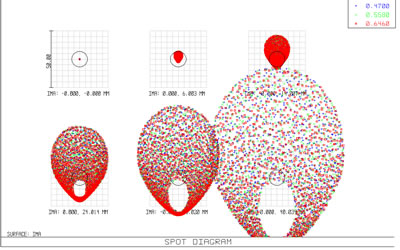 - Einsatz eines Korrektursystems im Sekundärfokus: Da das Cassegrain-System nur in einem kleinen Gesichtsfeld von etwa 12 mm Durchmesser beugungsbegrenzt ist, muss für große Gesichtsfelder ein Korrektor eingesetzt werden. Der speziell berechnete und gefertigte Korrektor für den Sekundärfokus liefert ein beugungsbegrenztes Gesichtsfeld von 80 mm Durchmesser. Dabei wird die Systembrennweite auf 8500 mm verlängert. Siehe Spot-Digramme weiter unten.