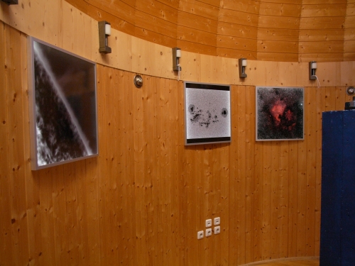 Bilder der Sonne und eines Gasnebels zeigen Entstehung und Aufbau der Sterne. Rechts im Bild ist die Säule zu erkennen. Sie trägt die Montierung des Fernrohrs. |