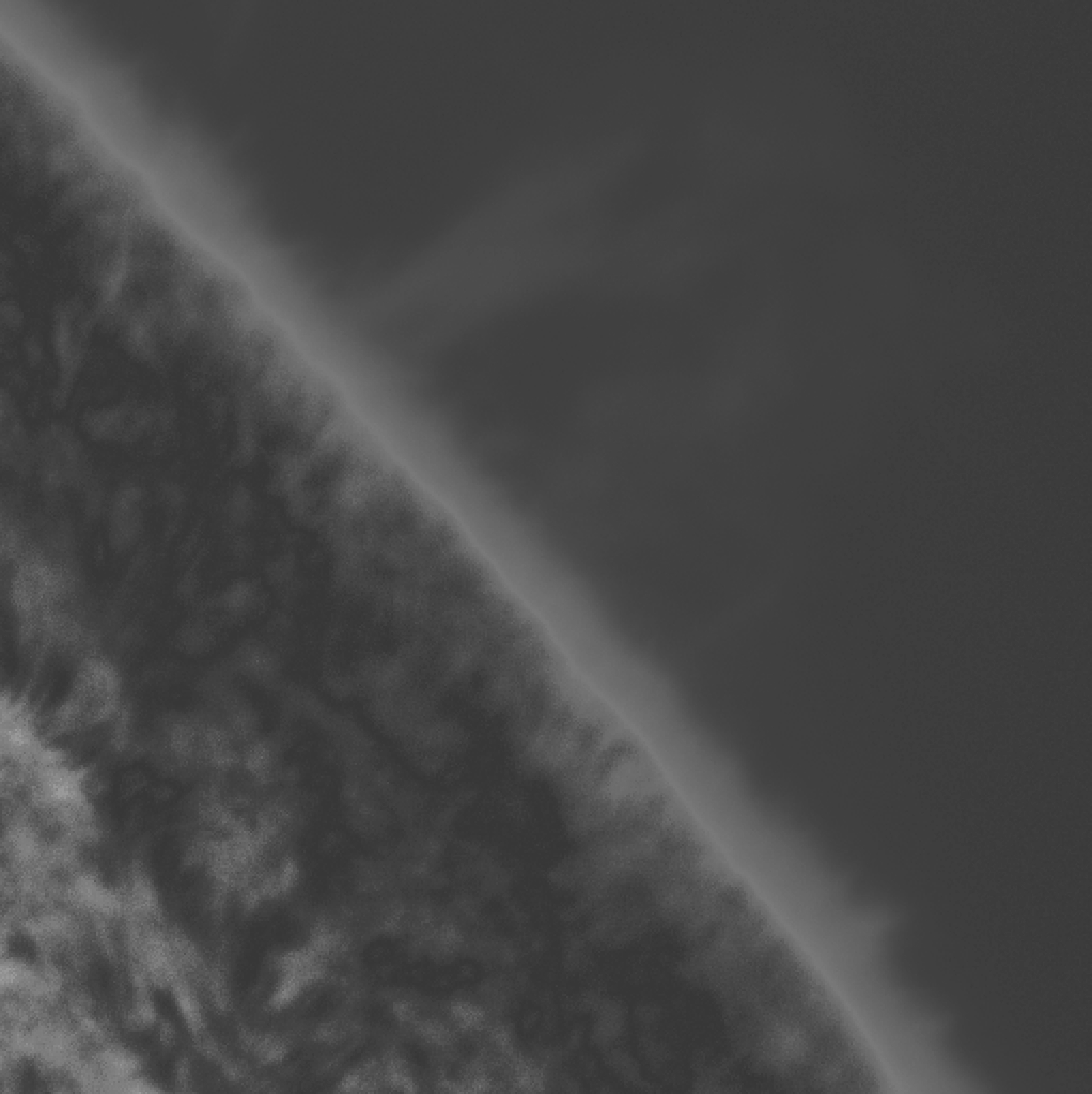 Auf diesem Bild ist die Chromosphäre als schmaler, heller Streifen deutlich zu sehen. Sie hat eine Dicke von etwa 5 000 bis 10 000 Kilometer und bildet die Grenze zwischen Photosphäre (rechts unten) und der Korona (links oben). Im Streifen der Chromosphäre sind zur Korona hin feine Fäden zu sehen. Das sind die Spikulen, Röhren, die die Fortsetzung der Granulation bilden und in denen der Energie-Transport durch Schallwellen erfolgt. Dadurch ist es möglich, dass sich die Korona auf einige Millionen Kelvin aufheizt. |