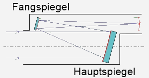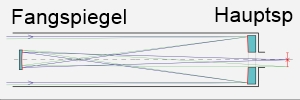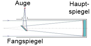 Das Licht des Objektes fällt auf den Hauptspiegel (parabolisch geschliffen) und wird zum Fangspiegel (konvex-hyperbolisch) reflektiert. Durch die Durchbohrung im Hauptspiegel lenkt der Fangspiegel das Licht zum Okularauszug, wo das Zwischenbild entsteht, das mit einer Lupe, dem Okular, betrachtet wird. Das Blendensystem von Haup- und Fangspiegel dient zur Ausschaltung von Streu- und Fremdlicht.