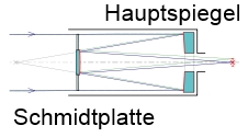 Der Fangspiegel ist in der Mitte einer dünnen Glasscheibe (Schmidt-Platte) mittels einer Spiegelfassung als separates optisches Glied angebracht. Die Aufgabe dieser Korrektionsplatte ist es, die sphärische Aberration des Hauptspiegels zu beheben und die Koma des Gesamtsystems zu minimieren. Wegen der Verwendung von Spiegeln und Linsen in einem Fernrohr, spricht man von einem katadioptrischen System.