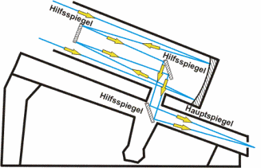 Der Coudé-Fokus Dieses aufwendige System, bei dem der Strahlengang in die Polachse ausgespielt wird, findet an Großteleskopen Verwendung. Die Polachse steht fest, sie ist auf den Himmelspol ausgerichtet. Hier können schwere Geräte, wie ein Spektrometer, eingesetzt werden. |